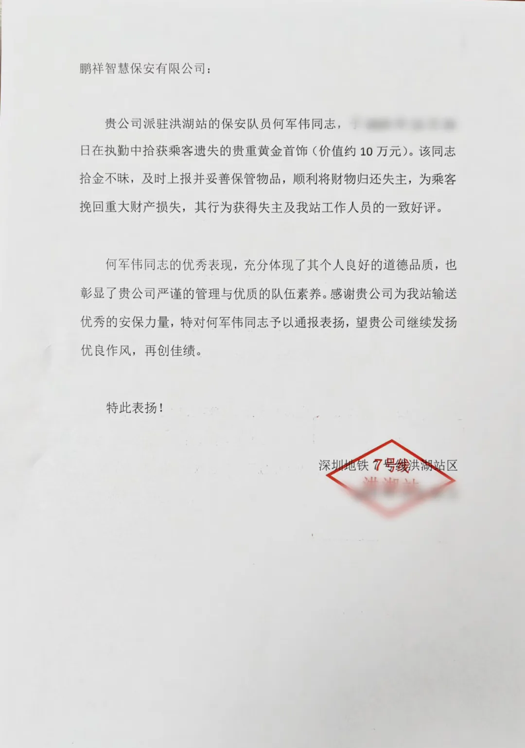 何军伟的诚信行为,既体现了个人高尚品德,也展现了鹏祥队伍严谨的管理作风和良好的精神风貌。事后,车站对何军伟予以致信表扬。