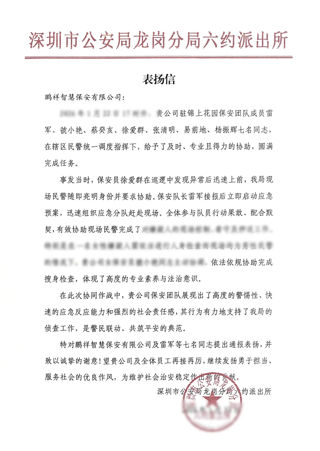 2026年1月,锦上花园项目队员徐爱群接业主反映异常情况后迅速响应,在辖区民警执行抓捕任务且警力紧张的状态下,保安队长雷军立即启动预案,带领应急队员易前地、杨振辉、张清明及保安班长蔡癸亥赶赴现场。