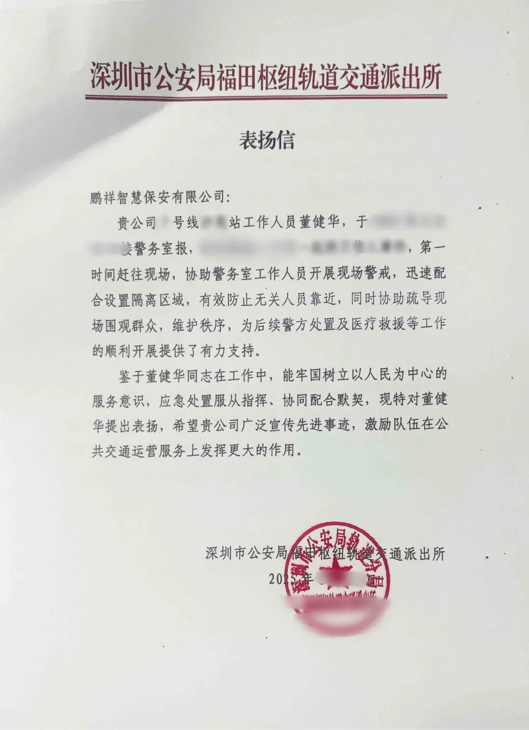 近日,某地铁站中发生伤人事件,驻站队员董健华接报后第一时间赶到现场,迅速配合民警设置隔离区、疏导围观人群,有效控制现场秩序,防止事态扩大,为后续处置与救援创造了有序环境。董健华在突发事件中表现冷静、处置专业,展现出良好的应急素养和责任意识,获得了派出所的书面表扬。